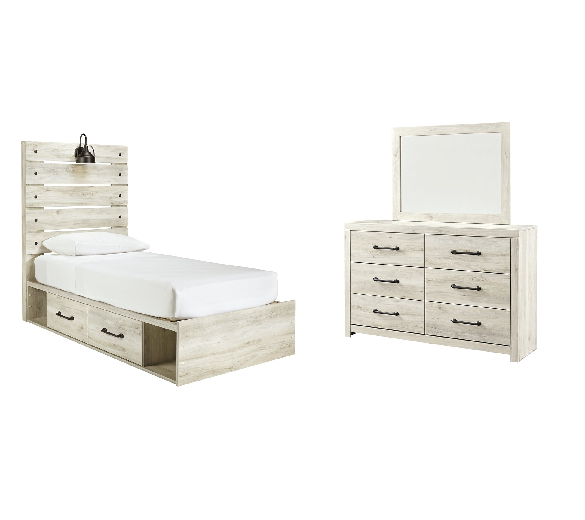 | Details | B192B1: Includes dresser with mirror, Made of engineered wood (MDF/particleboard) and decorative laminate, Wispy white finish over replicated oak grain with authentic touch, 6 smooth-gliding drawers, Drawer interiors are lined with a faux linen laminate for a clean, finished look, Large-scale hardware with dark finish, Mirror attaches to back of dresser, Assembly required, B192B17: Includes headboard, footboard, side storage, rail and slats, Made of engineered wood (MDF/particleboard) and decorative laminate, Wispy white finish over replicated oak grain with authentic touch, Large-scale hardware with dark finish, 2 decorative sconce lights, LED with 3 AA batteries, 2 smooth-gliding storage drawers, 2 storage cubbies, 2 slim-profile USB charging ports, Power cord included; UL-listed, Bed does not require additional foundation/box spring; accommodates most zero clearance adjustable bases with the addition of a bunkie board, Mattress available, sold separately, Assembly required, | |
